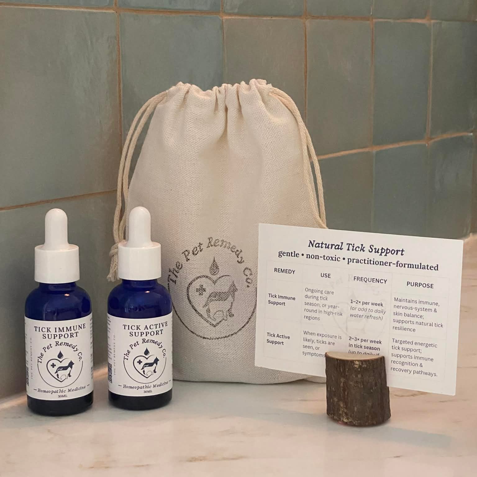 Supports natural resilience and balance in dogs, cats, and other animal companions during periods of increased tick exposure, seasonal pressure, and environmental challenge. A paired homeopathic support system designed for guardians seeking a gentle, terrain-based approach to tick season care.